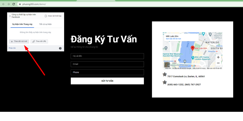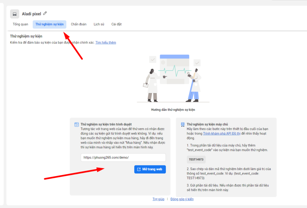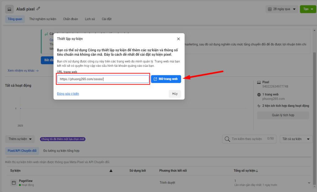 Để xem bạn đã thiết lập pixel của mình đúng hay chưa hãy chọn Tab Thử nghiệm sự kiện, điền tên miền vào ô bên dưới và bấm mở trang web