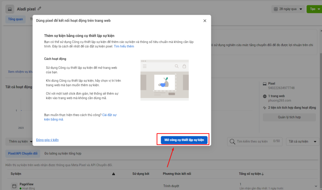 Khi thiết lập xong Pixel, tới bước định nghĩa cho pixel bằng cách bấm vào nút Thêm sự kiện và chọn Từ pixel