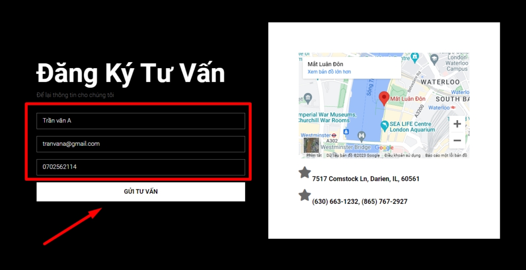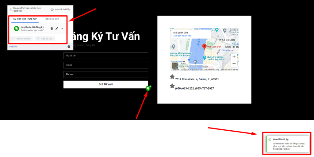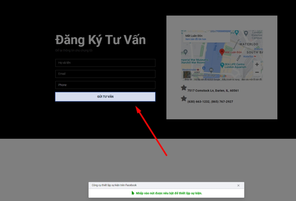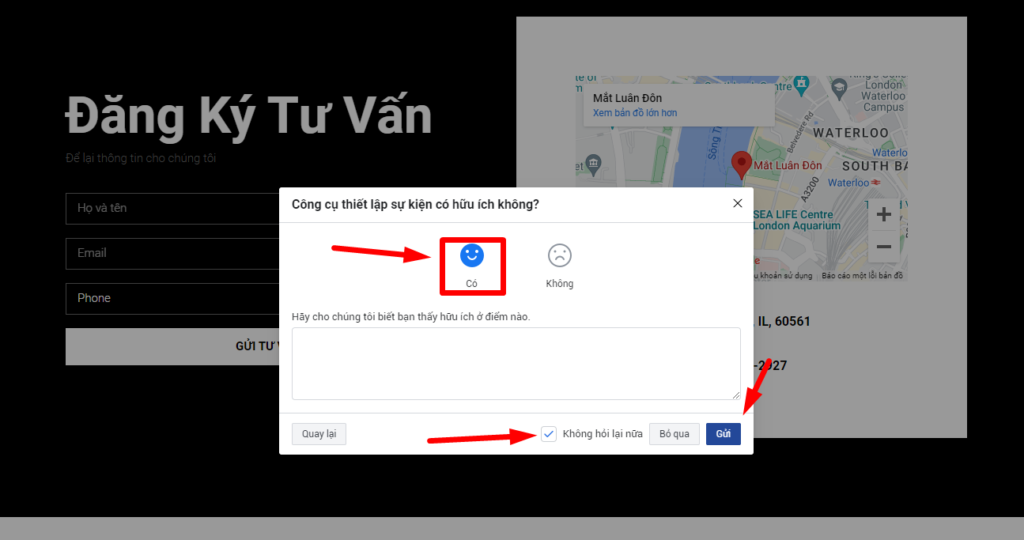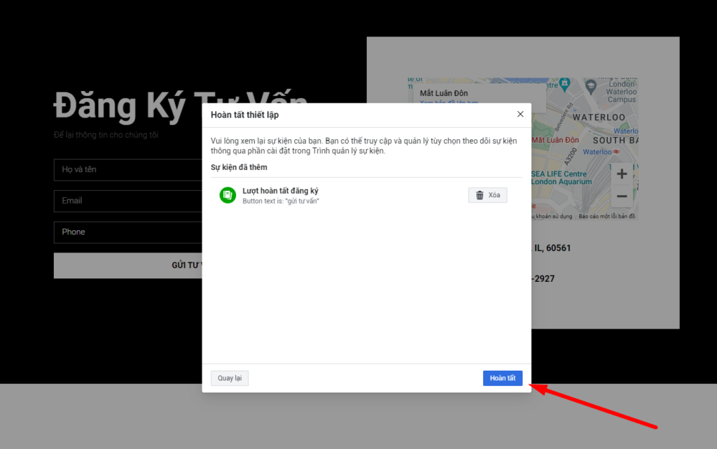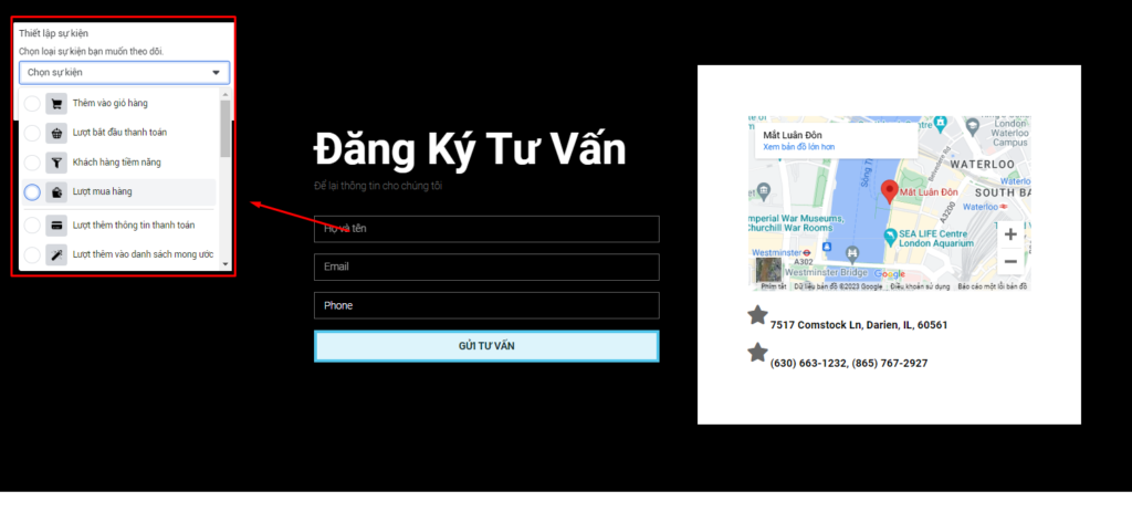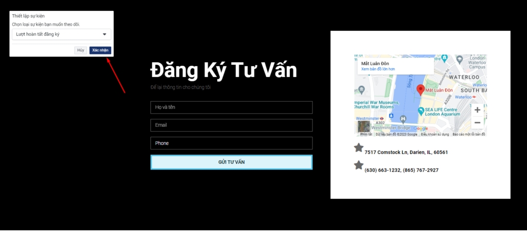 Chọn nút mà bạn muốn theo dõi chuyển đổi, ở đây mình chọn nút Gửi Tư Vấn và chọn hành động là Lượt hoàn tất đăng ký khi có khách hàng đăng ký vào Form và bấm Xác nhận.