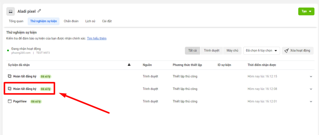Trên phần Thử nghiệm sự kiện đã có Hoàn tất đăng ký có nghĩa bạn đã thiết lập đúng