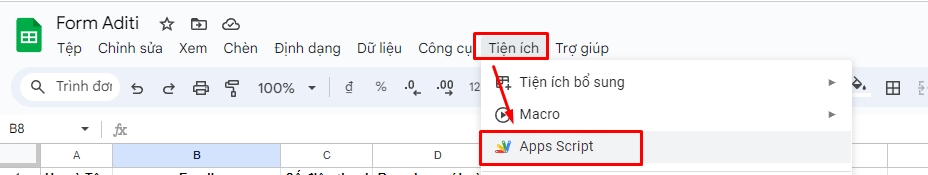 Bước 2. Ở trong bảng tính, chọn Tiện ích –> Apps Script