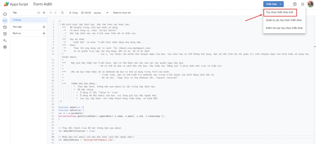 Bước 3. Đổi tên cho Apps, và dán đoạn mã bên dưới vào (Lưu ý: Nhớ đổi Email ở dòng 40)
