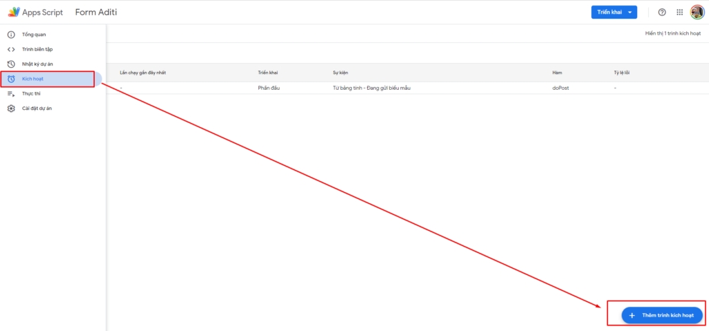 Bước 7. Chọn Kích hoạt –> Thêm trình kích hoạt