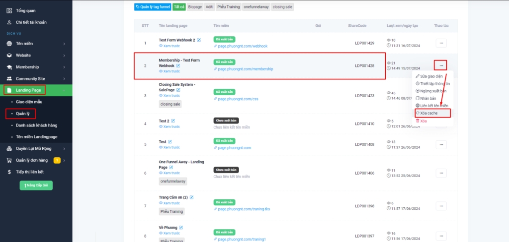 Bước 5. Quay ra trang Quản lý landing page và Xóa Cache