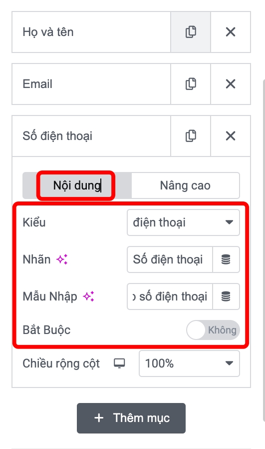 Bước 3: Ở tab “Nội dung”, bạn điền Kiểu là “Điện thoại”; nhập “Nhãn” và “Mẫu nhập” cho phù hợp.
