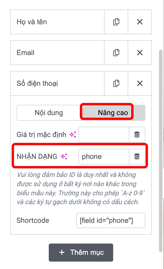 Bước 4: Vẫn ở mục “Số điện thoại”, bạn qua tab “Nâng cao” , chỗ Nhận dạng, bạn nhập vào “phone” như hình dưới