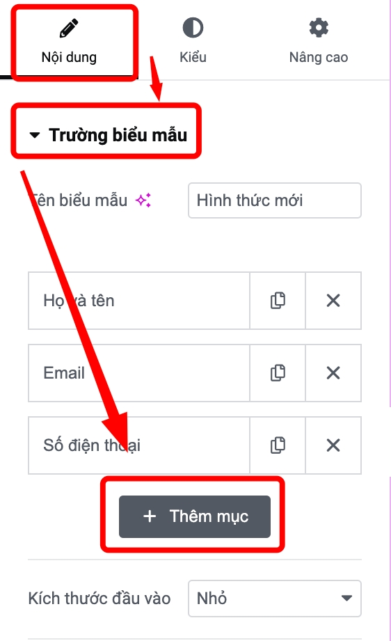Bước 2: Ở tab Nội dung –> Trường biểu mẫu, bạn click vào “Thêm mục”