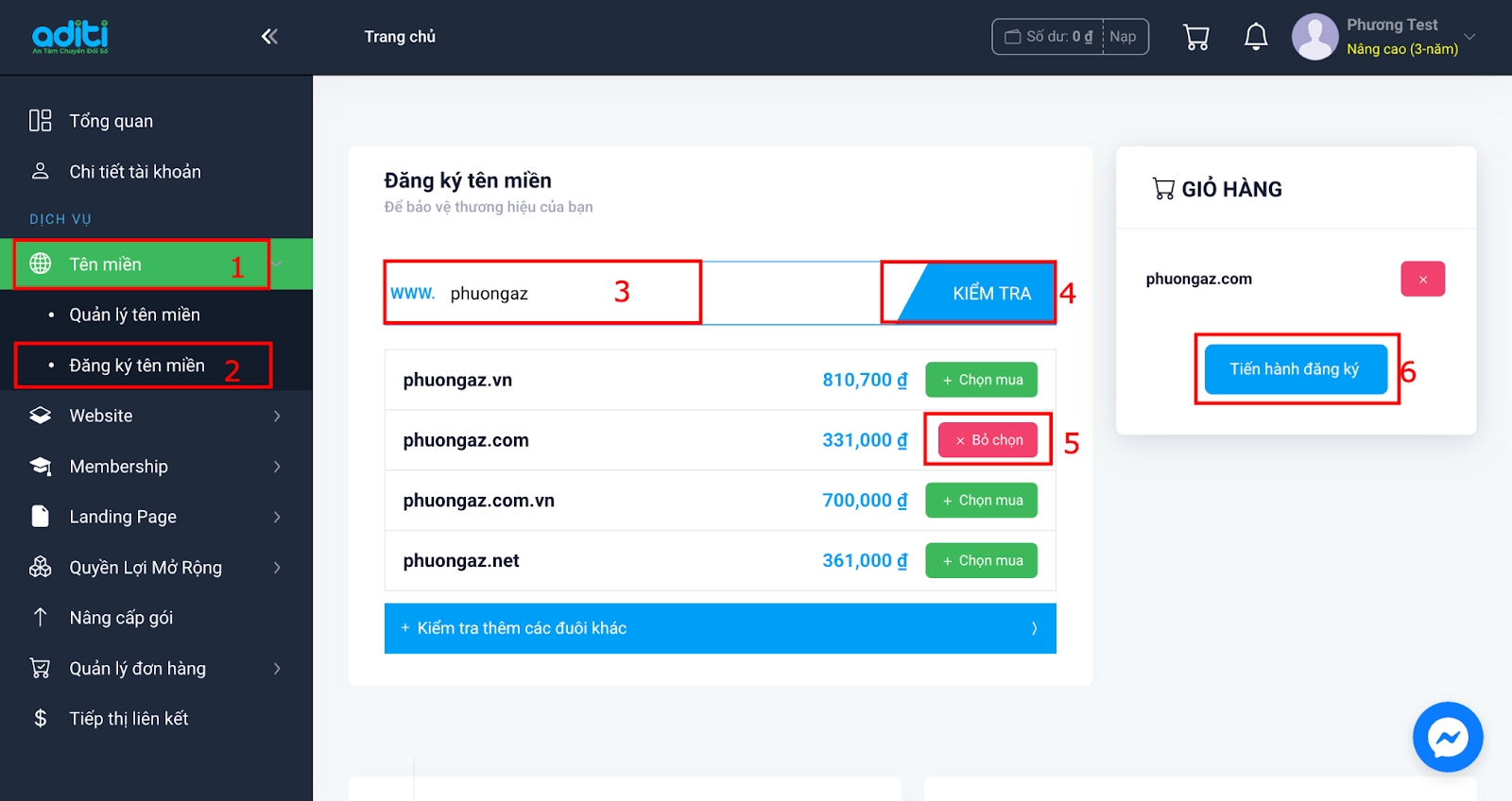 Đây là nơi để bạn mua tên miền trên nền tảng ADITI. Ở đây có rất nhiều tên miền khác nhau để bạn lựa chọn Và để mua tên miền, bạn cần làm như sau: