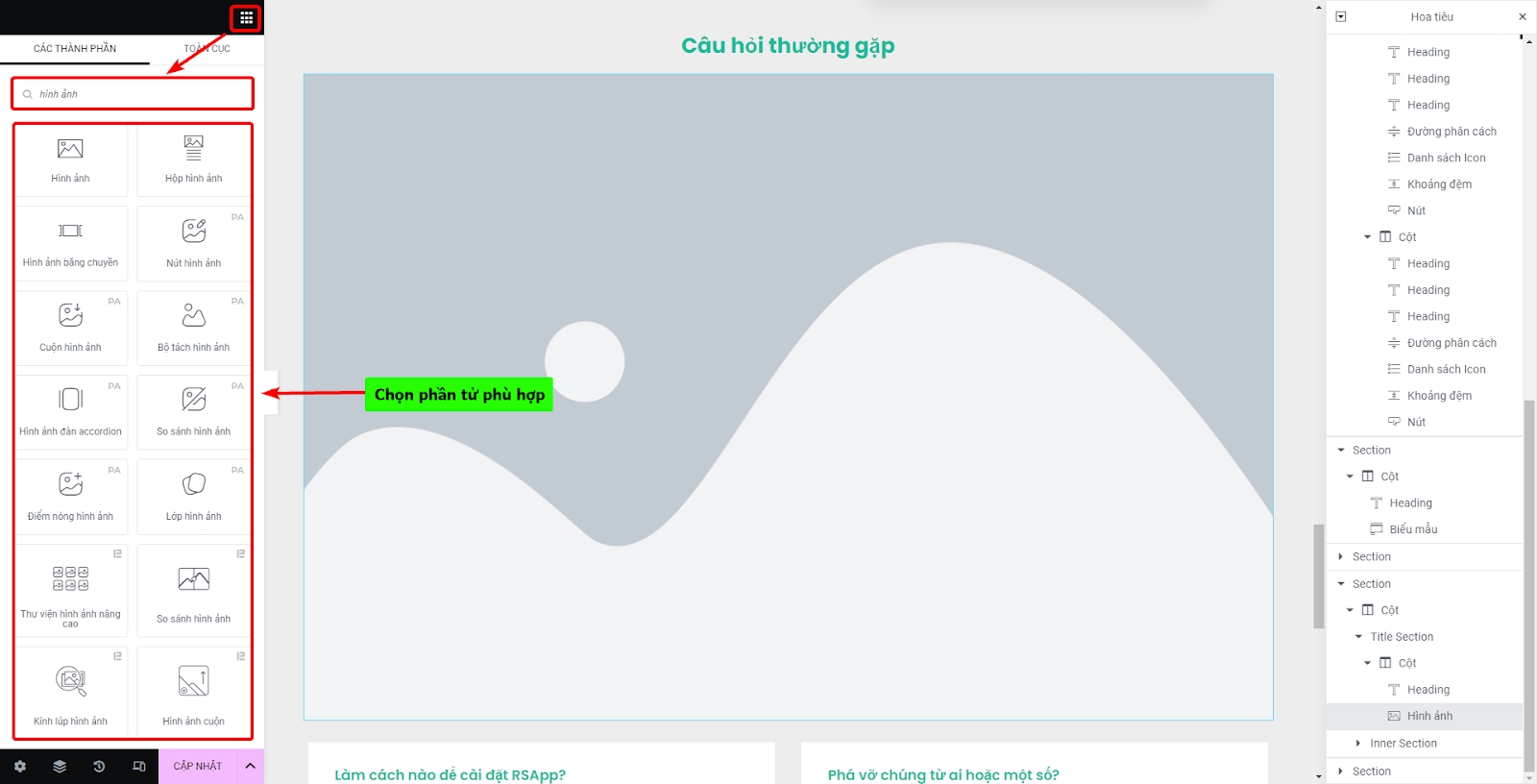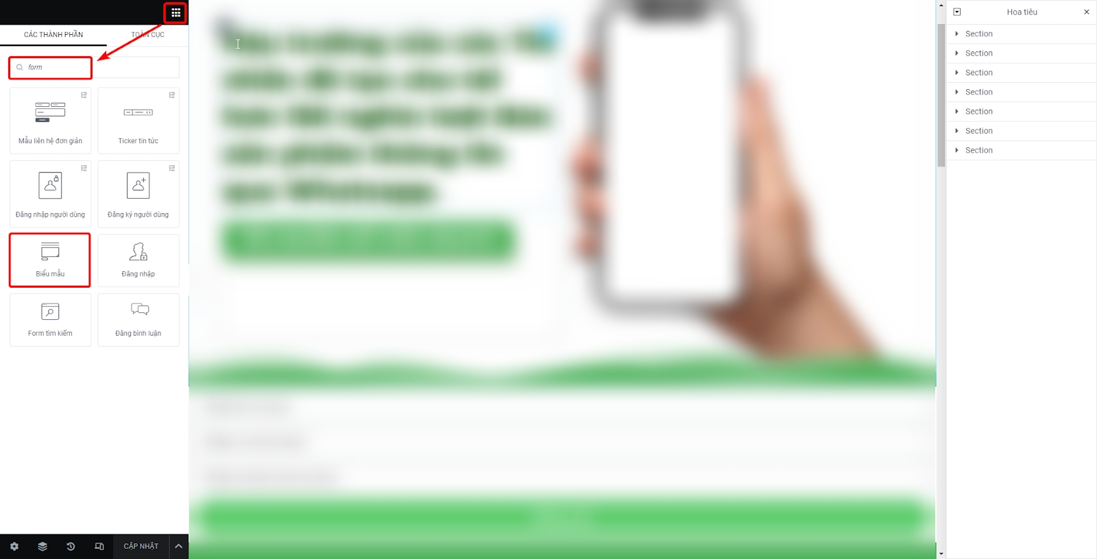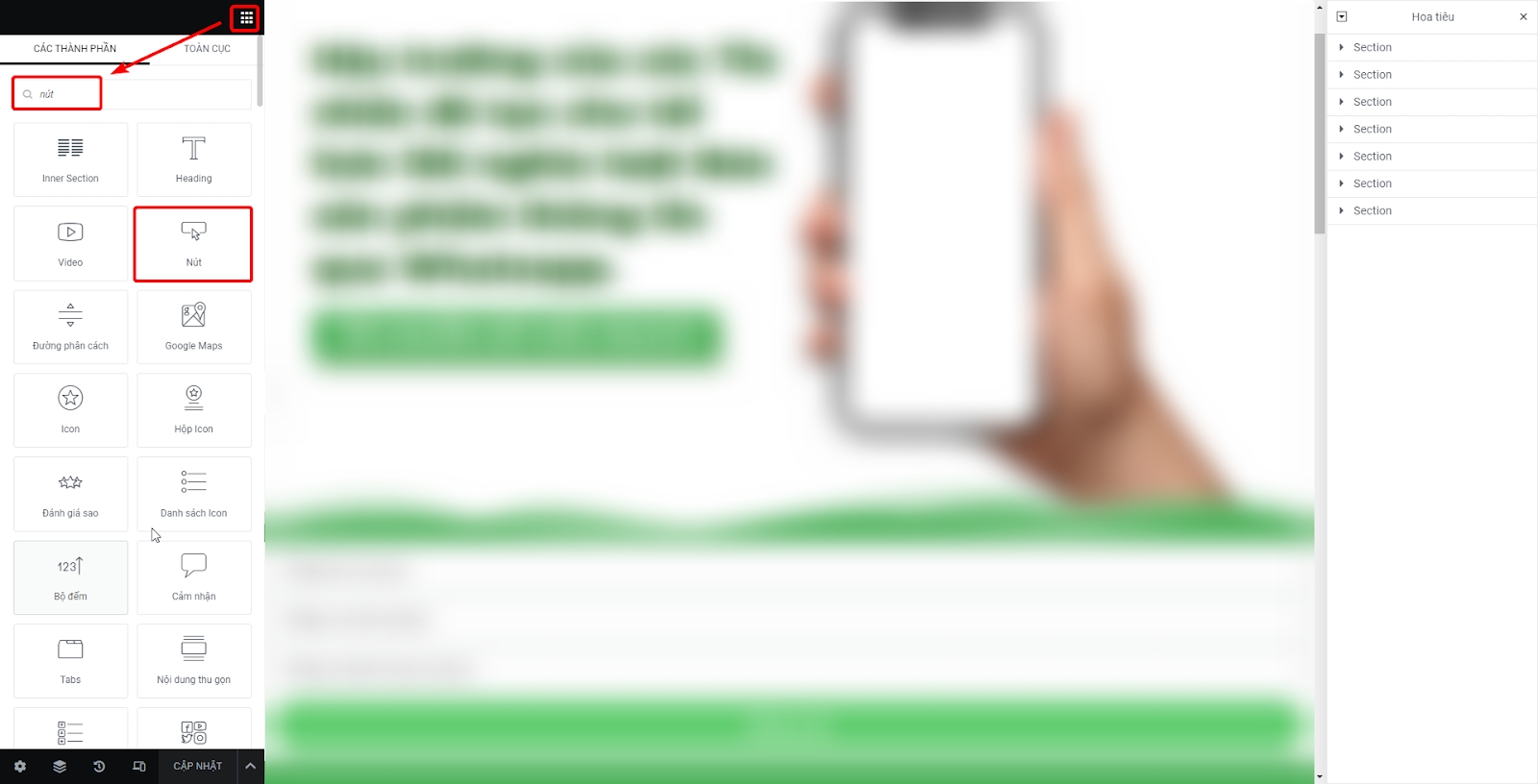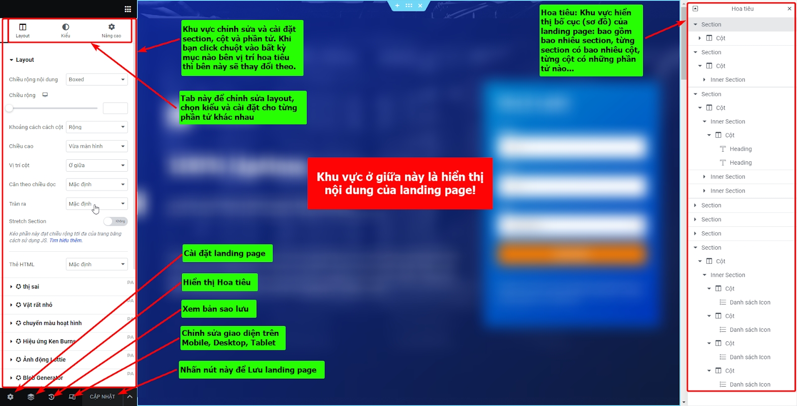 1 landing page gồm 3 phần chính: Section → Cột → Phần tử. Được hiển thị như hình dưới