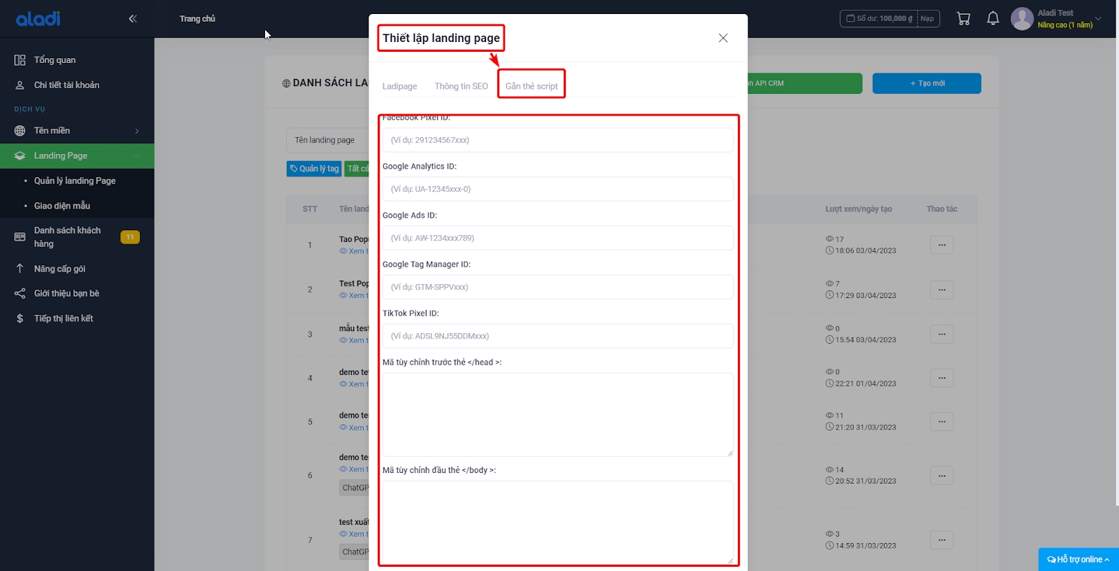 Tracking: là mã theo dõi hành vi khách hàng. Aditi cho phép bạn chèn mã tracking ID vào Facebook Pixel, Tiktok Pixel, Google Analytics, Google Ads và Google Tag. Để cài đặt mã theo dõi, bạn xem hình dưới