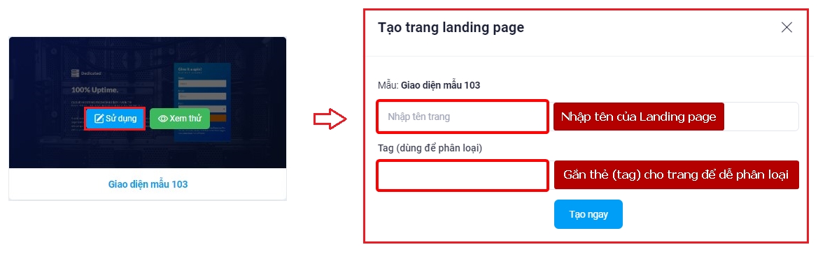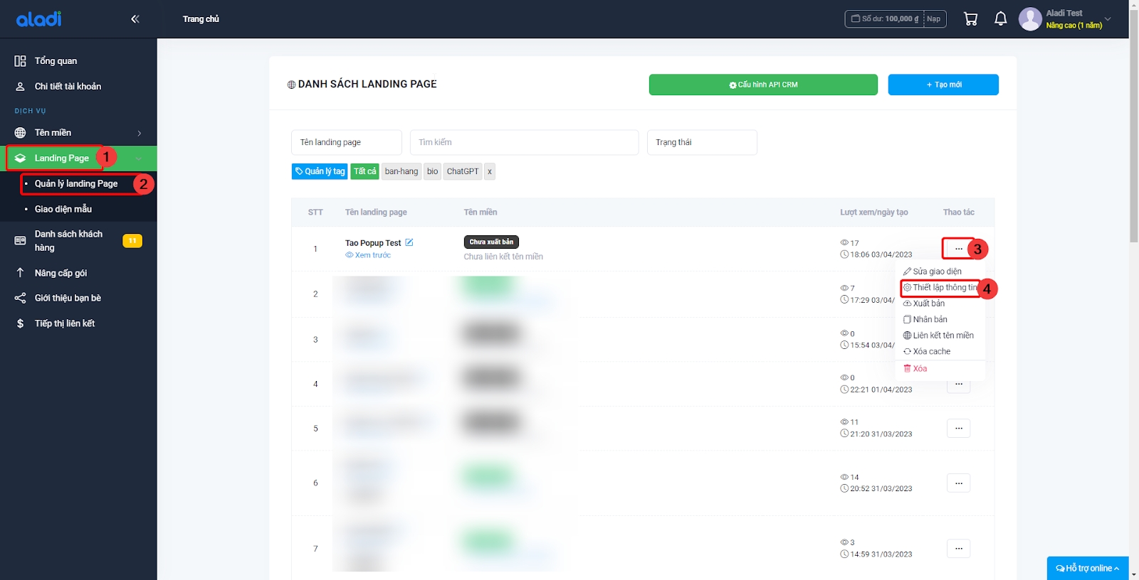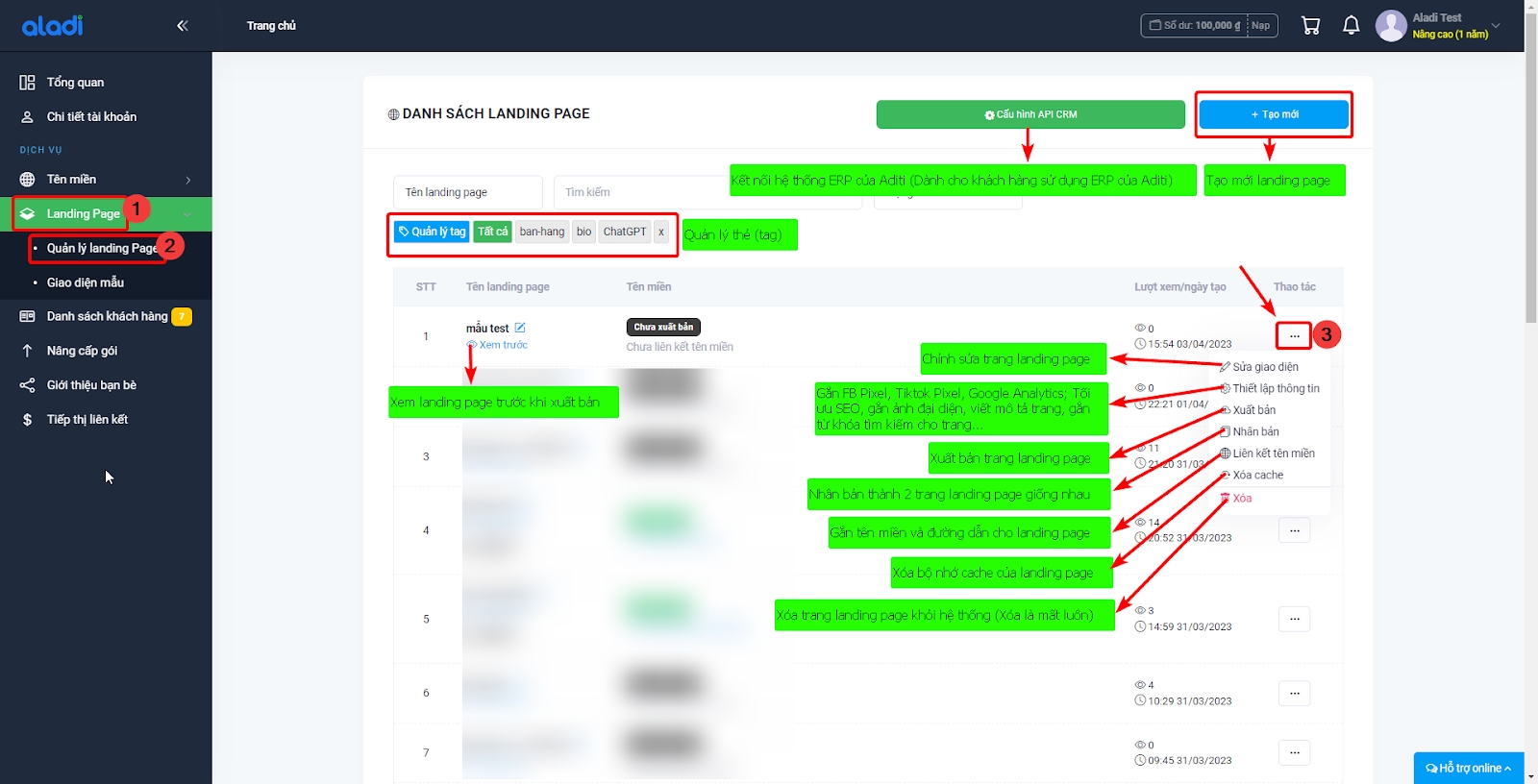 Tiếp theo là quản lý trang landing page. Xem hình dưới để hiểu rõ hơn cách sử dụng