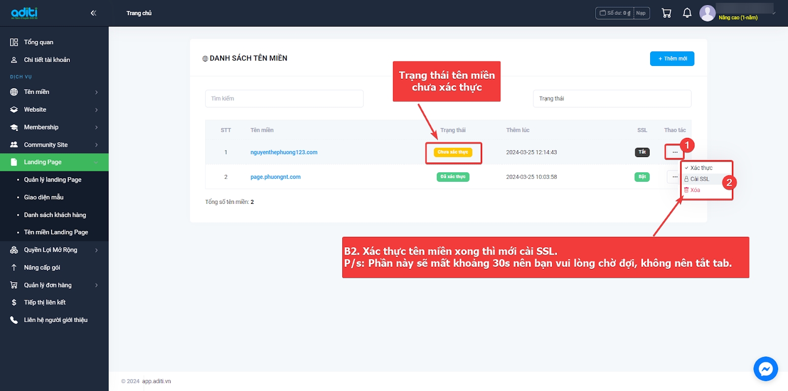 Sau khi thanh toán để nạp tiền thành công. Bạn cần phải mua tên miền, sau đó bạn hãy cài đặt tên miền vào mục Landing page như bên dưới (Lưu ý, bạn phải mua và thanh toán tên miền trước khi làm bước này)