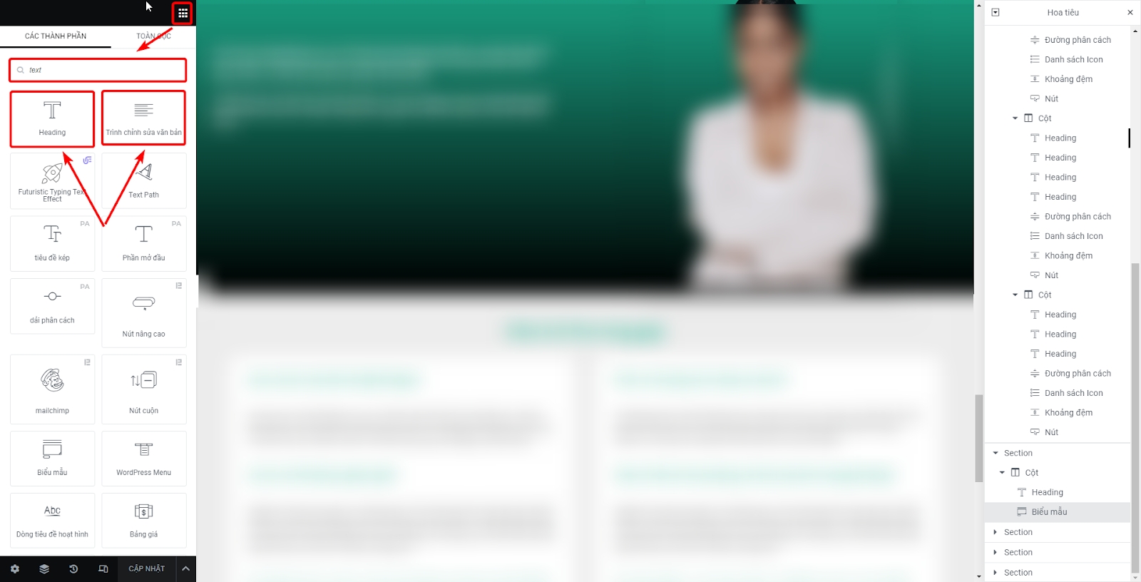 Cách thêm Heading/Text rất đơn giản, bạn chỉ cần gõ từ khóa “Heading” hoặc “Text” sau đó chọn phần tử phù hợp là được. Xem hình dưới