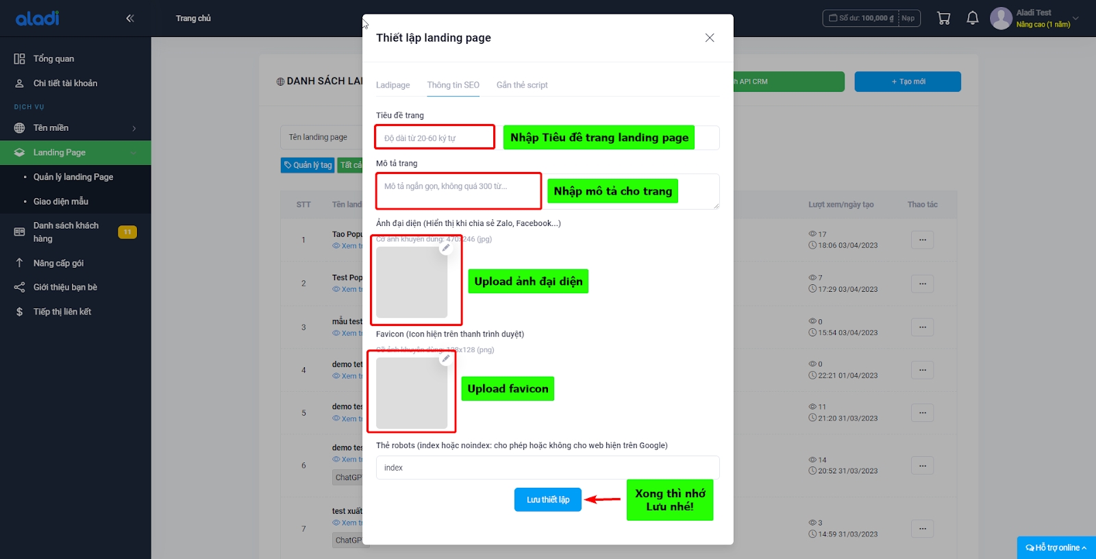 SEO: Khi bạn muốn đặt tên cho landing page, thêm từ khóa, mô tả về landing page cũng như đổi favicon và hình đại diện thu nhỏ thì xem hình III.1 và III.2