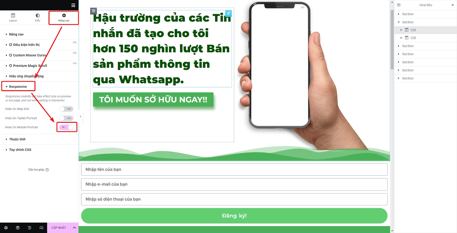 Ẩn/ Hiện section/ phần tử: Là tính năng giúp bạn ẩn các đoạn nội dung, và chỉ hiển thị khi click vào nút bấm tương ứng: Để thực hiện, bạn làm theo bước sau: Chọn Phần tử muốn ẩn → Chọn tab Nâng cao → Chọn mục Responsive → Bật nút Ẩn trên thiết bị nào mà bạn muốn. Xem hình dưới