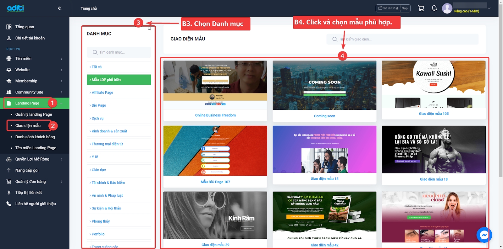 Có 2 cách để tạo trang landing page: 1 là tạo bằng trang trống, 2 là chọn giao diện mẫu. Bạn chỉ cần làm theo như hình dưới để biết cách chọn trang phù hợp.