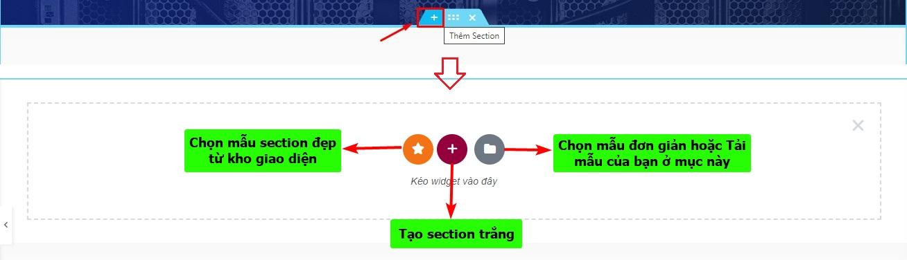 Để bắt đầu tạo mới một Section, bạn nhấn vào vị trí bất kỳ của section, sau đó nhấn dấu + và chọn mẫu section từ Kho giao diện hoặc trang trống tùy vào nhu cầu của bạn