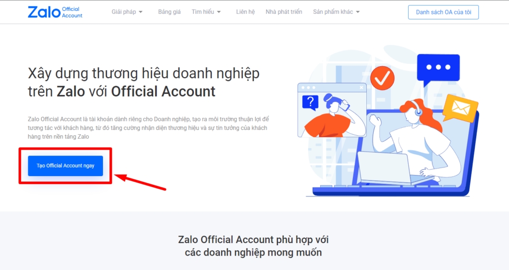 Bạn truy cập vào website https://oa.Zalo.me/home để tiến hành lập tài khoản. Các thao tác ở đây rất đơn giản, được chú thích và hướng dẫn chi tiết.
