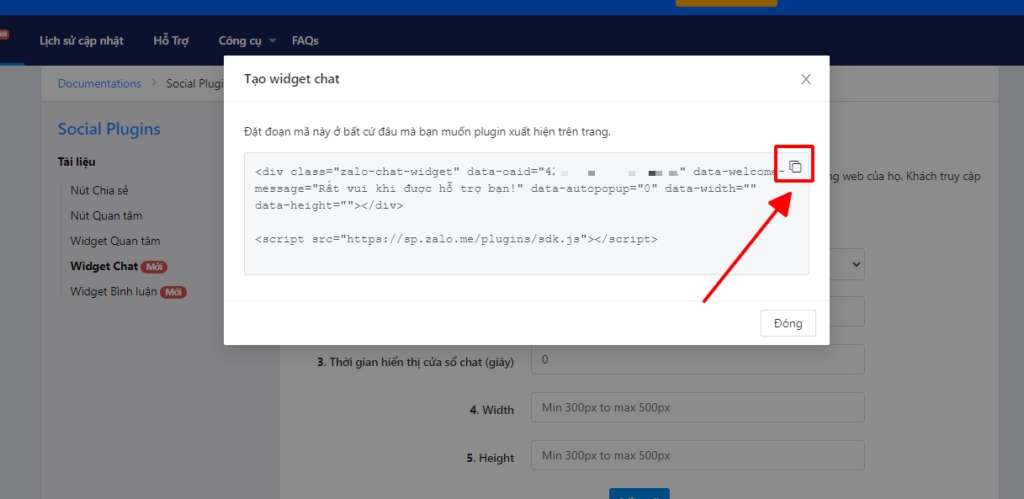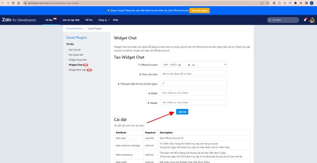 Truy cập vào đường link: https://developers.zalo.me/docs/social/zalo-chat-widget Điền thông tin và bấm Lấy mã